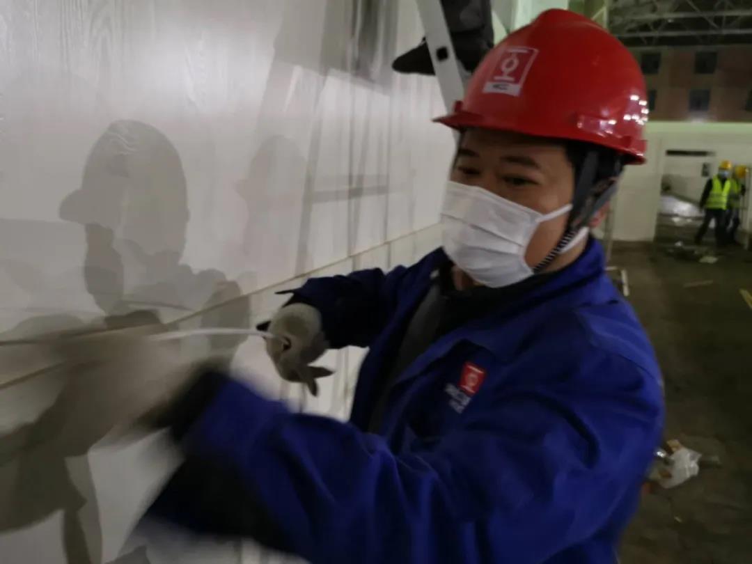 来武汉客厅的第一天就是“白加黑”。到在现场,他便迅速进入了角色,临电安装、接线、搬运铺设床铺、安装隔离门板、脏活累活抢着干,丝毫不马虎。一双手套不到半天就磨破了。三天三夜里马不停蹄,他既是现场电气工长。还是后勤员,协调机具、记录考勤、……只要是力所能及的工作,他都一丝不苟。“说不辛苦是假的,紧绷的神经和压力、多日来连轴转的精力消耗对我们来说都是一种挑战,但是对比奋战在一线的医护人员,我们太微不足道了。”李玉林说。