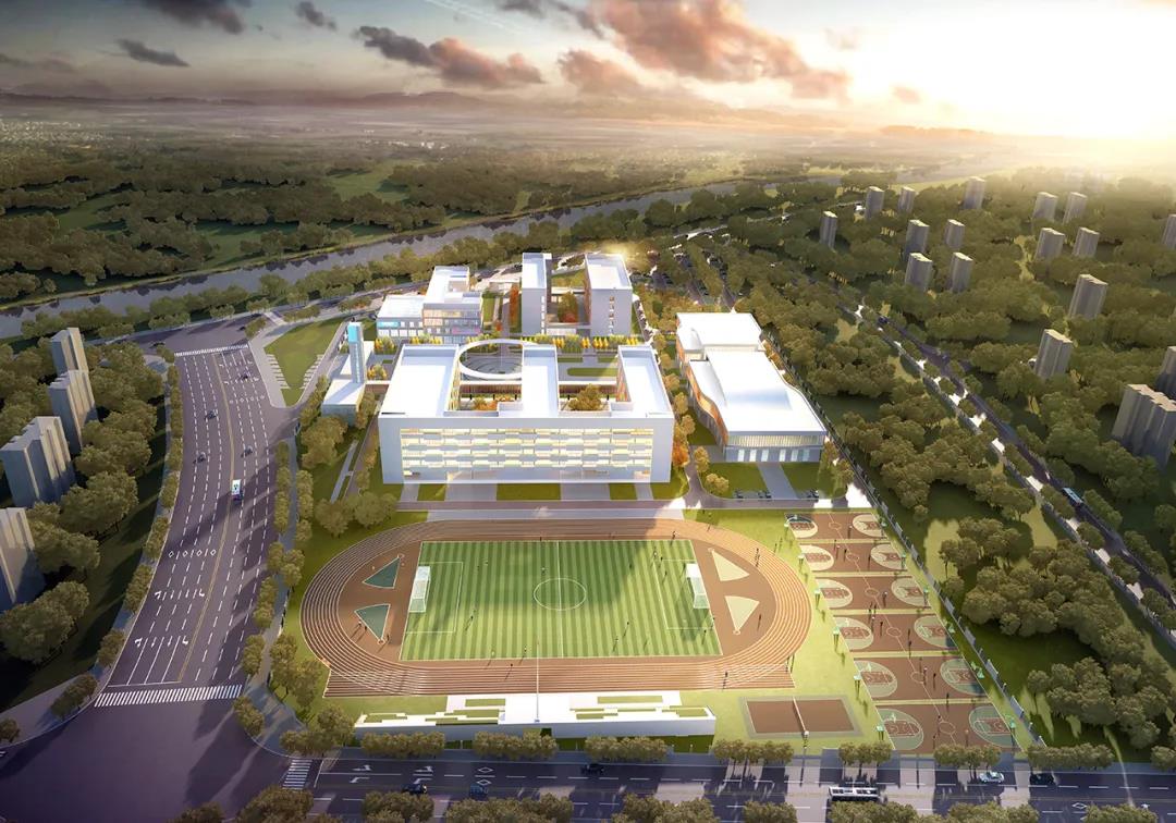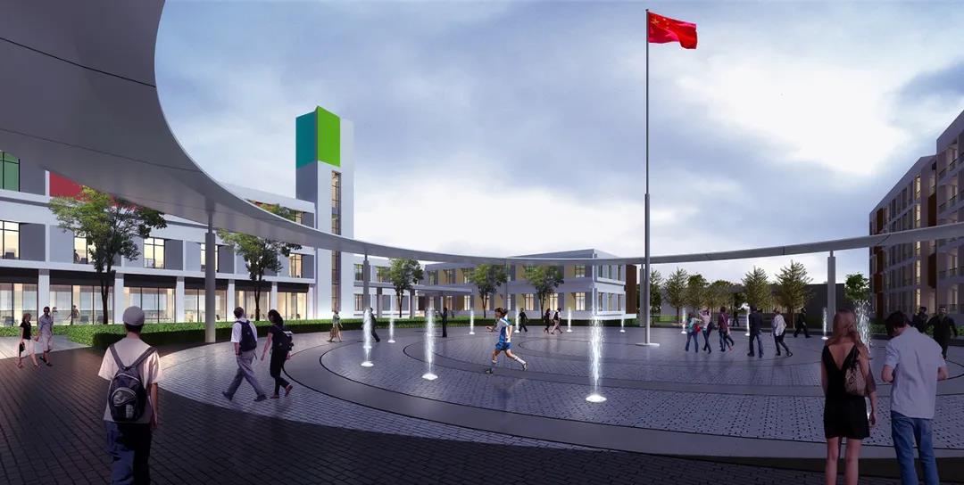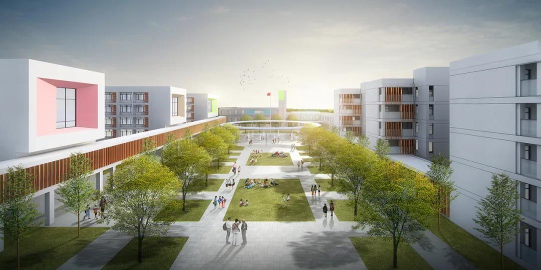 本项目致力于打造出一个具有高品质教学环境和时代气息的现代化校园。功能布局上以“智慧圆环”为中心,以入口林荫大道和中心景观大草坪为“双礼宾轴线”,根据动静分区原则将行政、教学、住宿、后勤和运动等五大功能分区合理布局,学习和生活空间采用半围合式院落布局,创造一个安静的教学环境,在满足教学及生活的基本功能情况下,同时为学生在课间休憩、课外学习、师生交流需求上设计出不同的空间场所。通过教学、社交、自然的相互碰撞融合形成一个轻松愉悦的学习环境。让青少年学生们在这里拥有逆风攀登向阳而生的力量。